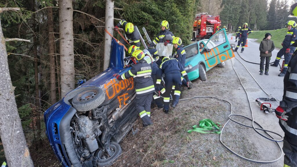 Übungsannahme war ein Verkehrsunfall mit eingeklemmter Person zwischen zwei PKW. Der Einsatzleiter konnte bei der Erkundung feststellen, dass in einem der beiden PKW noch eine Person eingeschlossen war, der Lenker des zweiten PKWs war abgängig. Auf der Anfahrt wurden die Kräfte eingeteilt, die Mannschaft des RLF-A 2000 begann sofort mit dem sichern der Unfall PKW sowie dem Schaffen einer Zugangsöffnung für einen Sanitäter. Nach dem Sichern der PKW und der Lagebeurteilung des Sanitäters im Fahrzeug wurde beschlossen, aufgrund des Zustandes der Person eine Crashrettung durchzuführen.
