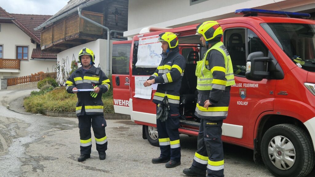 Nach eintreffen am Einsatzort begann der Einsatzleiter sofort die Erkundung der Einsatzstelle, zeitgleich errichteten drei Mann im MTFA Koglhof eine Einsatzleitung. Da der Einsatzleiter bei der Erkundung erfuhr, dass sich noch zwei Personen im Brandobjekt befanden, wurde der Atemschutztrupp vom RLF-A 2000 umgehend mit der Menschenrettung beauftragt. Der KLF-A Koglhof sowie der LKW-A Koglhof begannen umgehend mit dem Erstellen einer Zubringleitung vom Löschteich Sallegg Richtung Brandobjekt. Die eintreffenden Wehren Birkfeld und Viertelfeistritz stellten jeweils eine Tragkraftspritze als Verstärkerpumpe Pumpe, um genügend Wasser an die Einsatzstelle zu liefern. Das HLF 4 Anger diente als Pufferfahrzeug zwischen Zubringleitung und dem RLF-A 2000 Koglhof. Ebenfalls begann die FF Anger mit dem Außenangriff. Die FF Viertelfeistritz stellte noch einen Atemschutztrupp und unterstützte beim Außenangriff. Die FF Heilbrunn erstellte eine Zubringleitung von einem weiteren Löschteich zu ihrem HLF und schützte das Wohnhaus vor Übergreifen der Flammen.