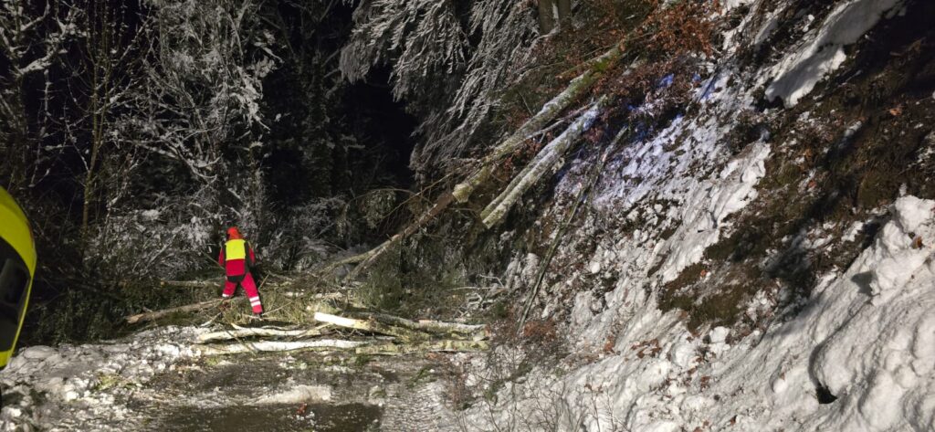 Am 21.02.2026 wurden wir um 05:36 zu einer Baumbergung ins Schlosstal alarmiert. Mrhrere Bäume blockierten die zufahrtstraße ins Schlosstal und wurden mittels Kettensäge entfernt.